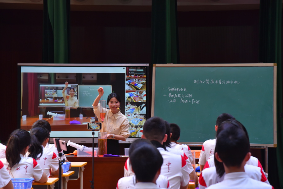 成都七中初中学校天环校区李思雅老师与天环校区2026届10班的同学们带来《制作简易活塞式抽水机》跨学科课堂展示。李思雅老师以注射器为载体,引导学生构建活塞式抽水机模型。通过模拟实际抽水情境,引导学生成功突破单向阀设计难题,运用大气压强原理和工程结构实现水流的定向控制。课堂采用项目式学习法,将理论模型转化为可连续工作的抽水装置,在学生的小组合作自主探究中深化了对压强章节的理解。本课通过"做中学"模式,有效培养了学生的物理学科核心素养、工程思想与创新实践能力。