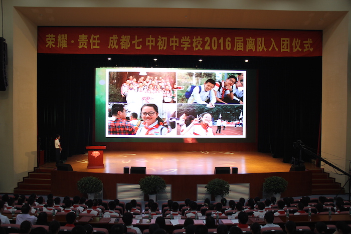 陪伴我们走过这一神圣时刻的有共青团四川省委张征书记,少年部安玲部长,高新区团工委副书记冉启平,还有初2016届全体老师、学校领导和家长代表。