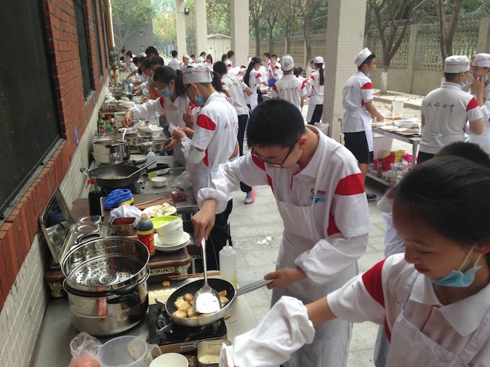 终于开始做啦!只见那一个个矫健的身影在灶台和洗碗池之间奔波。有的刀工娴熟地切菜,有的轻车熟路地烧水,还有的手脚敏捷地洗东西。。。。。。一个个都忙得不亦乐乎。真是没想到,平时大大咧咧的同学,做的都那么好。。。再次深深感觉到,成绩好不是一切,这些生活能力可一样重要。