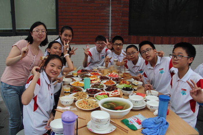同学们分成了五个小组,有序地操作着器具,希望在这次的课程中秀出自己的绝活,大放光彩。从洗菜、切菜、炒菜到分享,同学们相互配合相互帮助,乐在其中。在制作过程中,也有不少失败的作品,但同学们坚定的相信,只要找准方法并努力的尝试,就一定会获得成功。最后,各种各样的美食佳肴呈现在眼前:有鲜美的酸辣鱼,诱人的可乐鸡翅,香甜的布丁,自贡的冷吃兔,色香味俱全的石锅拌饭,还有集聚众人力量的多味饺子等。每一个人脸上都带着笑容,一种热情的气氛洋溢在其中,每个人都尽情享受着自己的劳动成果。各科老师受同学们的热情邀请前来品尝丰富的菜肴,都对同学们精湛的手艺发出了由衷的赞叹。还有一些老师系上围裙,亲自参与同学们的制作,现场一片欢乐祥和的气氛。