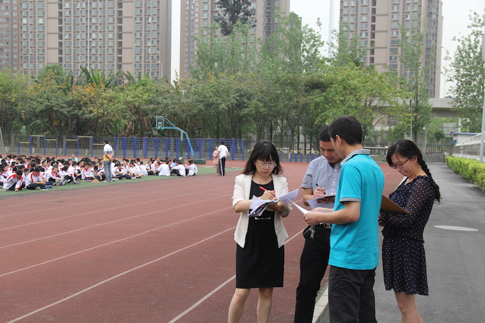 2015年5月12日上午10时18分校园中传来的一阵急促警报声拉开了“防震疏散演练”活动的帷幕,同学们在任课老师的指挥下实施“就近避险”,同学们迅速抱头就近蹲于桌下,各楼层的负责教师、班主任迅速到位,维持现场秩序。在第二次警报拉响后,全校三个年级31个班的同学们沿着预定路线,以书护头,猫腰前行,快速有序地紧急撤离到了操场。各班随即清点人数,并向学生工作部汇报。整个过程紧张有序、有条不紊,无拥挤、喧哗现象,全校教职工、同学们(包括外校来听课的老师)全部安全有序撤离到操场。邱兴华副校长对本次演练进行了点评。