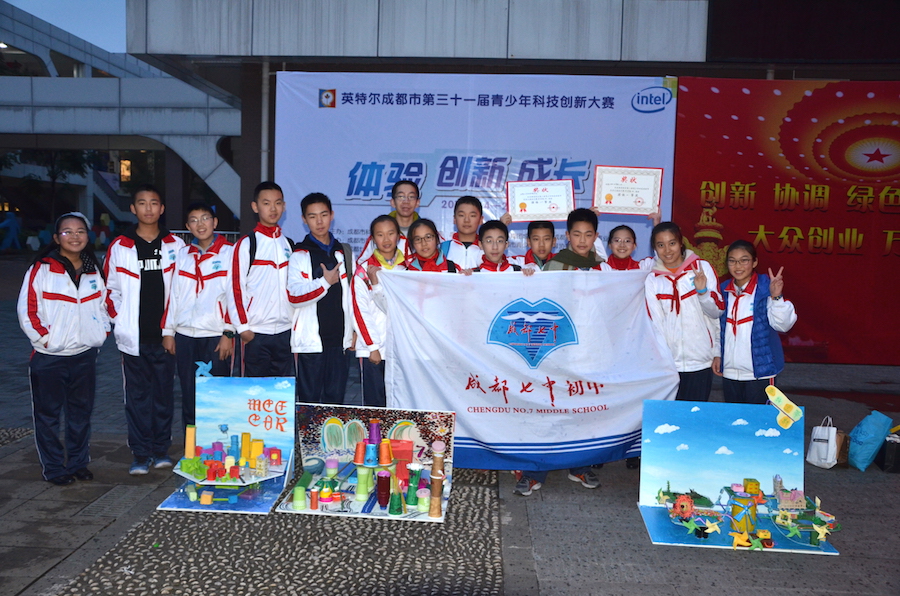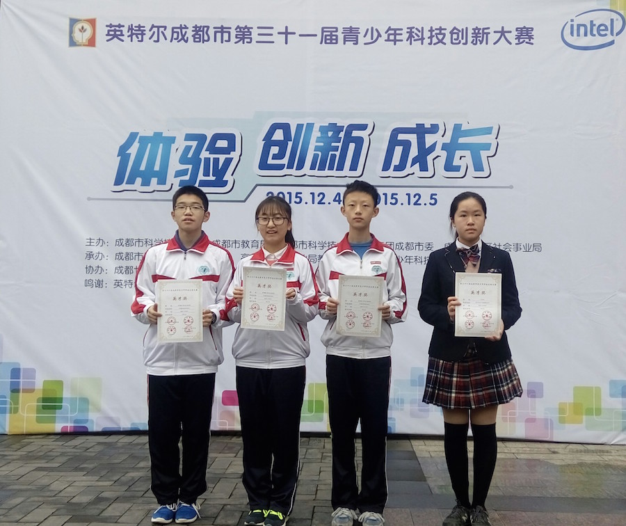 2015年12月4日-5日,我校在第三十一届成都市青少年科技创新大赛暨高新区第二届科技节中再创佳绩。我校共有138项作品参加本次成都市青少年科技创新大赛,获得了20多项一等奖。其中,沈珂宇同学的论文《刷牙前后口腔细菌培养》和曾鸣麒、邓州益、陈润明同学的程序设计《交通组织》获得了英才奖。在高新区科技节的“未来之城”设计比赛中,我校帅建明老师带领3支队伍共15位同学参加了比赛,获得两项团体一等奖。