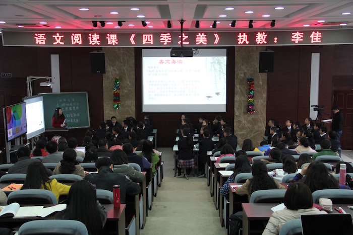 活动开始,语文组李佳老师和2018级10班同学共同为全校老师呈现了一堂别开生面的语文阅读课。他们借助一对一教学方式,共读四季美文,带领全校老师沉浸在美文、美景、美情之中。在教学过程中,我校语文组分成三个课堂观察小组,分别从技术使用、教师教学、学生活动三个维度进行课堂观察。随后,朱颖、李晓艳、巫增金老师分别代表三个观察小组对这节课进行了课堂观察的分析与评价。
