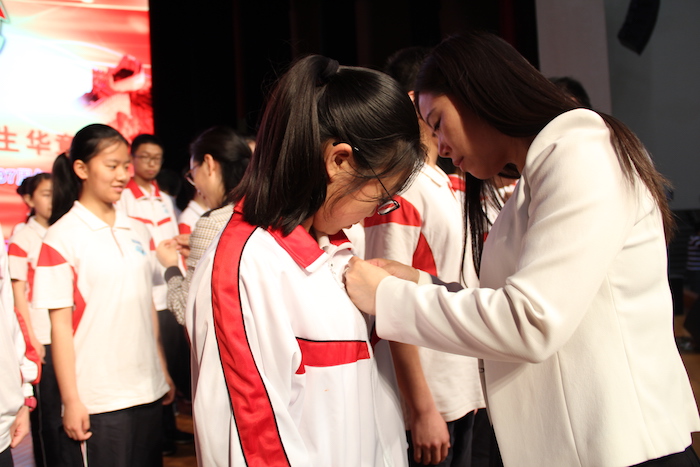 最后为2017届第一批55名同学举行了庄严的入团仪式,邱兴华副校长宣读首批共青团员名单,现场的嘉宾和老师们为他们佩戴团徽,并在全体师生共同见证下庄严宣誓,在这里我们见证了55位同学人生里程的又一次跨越,祝贺他们!