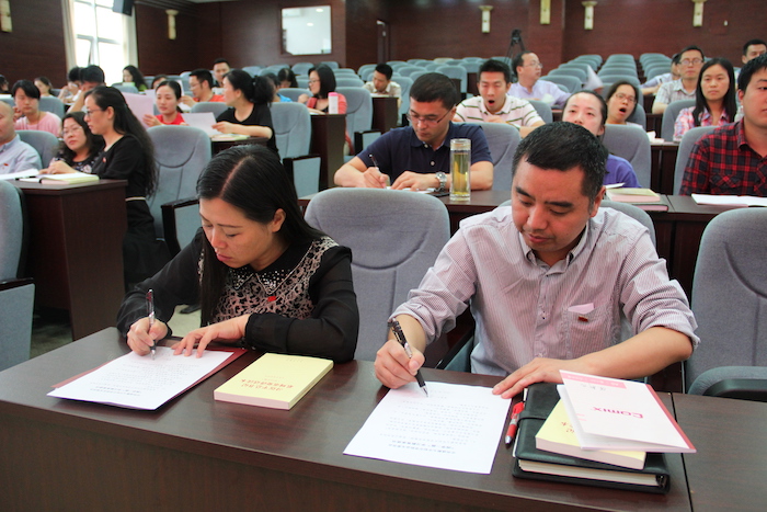 在党旗下,全体党员签定了《“两学一做”学习教育承诺书》,以党员教师的名义,庄严承诺:在“学党章党规、学系列讲话,做合格党员”学习教育中认真学习,积极讨论,带着问题学,针对问题改,理论联系实际,把解决问题贯穿学习教育全过程;竭尽所能,创造最适宜学生的教育,全力做到启迪有方,治学严谨,爱生育人;捍卫党员教师的尊严和荣誉,以人格引导学生,以学识服务学生,传授知识,弘扬真理;竭尽所能,为培养“审是迁善,模范群伦”的七初学生,恪尽职守,兢兢业业。