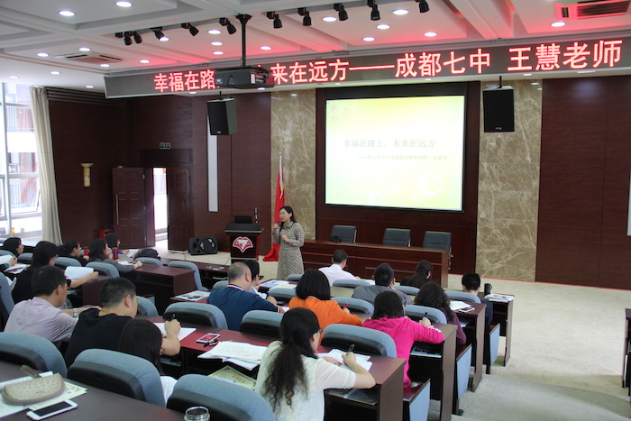 2016年5月25日下午,在成都七中初中学校学术一厅,来自成都七中林荫校区的优秀班主任、成都市优秀青年教师王慧老师给大家做了一场关于《幸福在路上,未来在远方》的专题讲座。