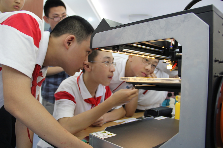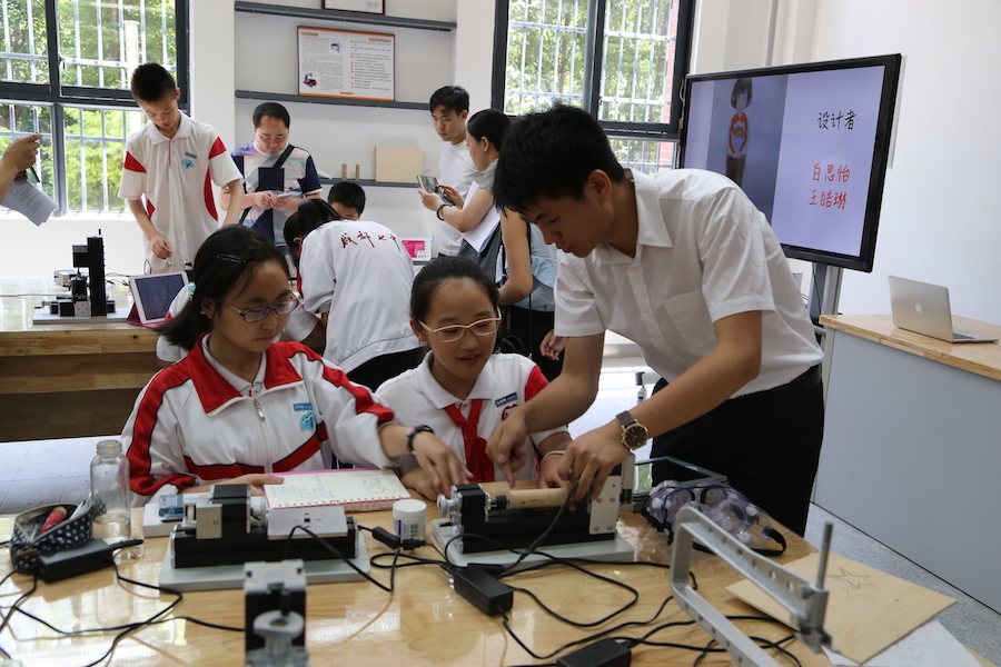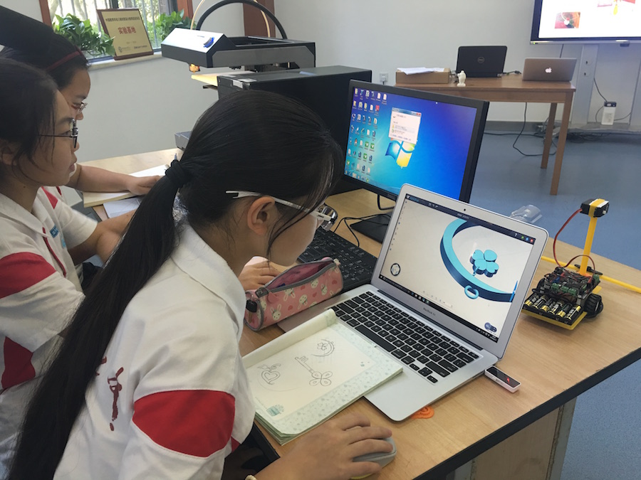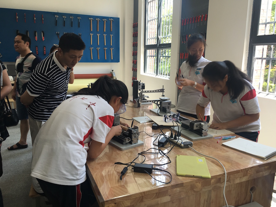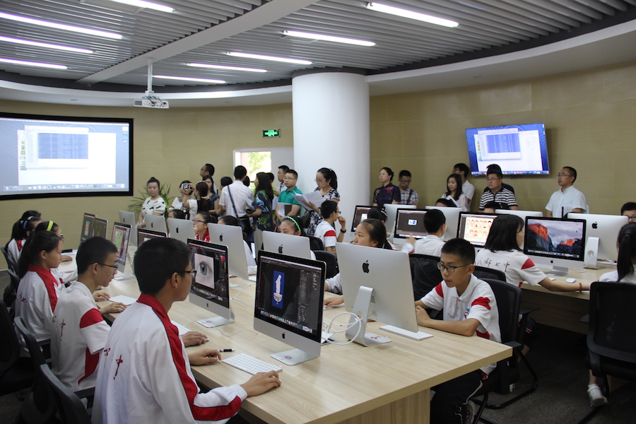 研讨会展示了物理组周钢老师执教的《两种电荷》,课堂上的学习探究逐步深入,微视频、现场拍摄以及 iTeach检测平台的使用,多种学习方式综合运用,让学生的认识更加深刻,学习过程更加真实。政治组肖丽萍与陈玉芳执教的财商课程《投资与理财》,两位老师指导学生通过竞赛端虚拟交易平台,模拟真实股市的同步交易,进行“七初华尔街争霸赛”股票实操练习。整堂课学生激动兴奋,观课的老师们也是兴趣盎然。美术组万里航老师执教的多媒体创意设计课程《公益海报设计》,让学生走进光与影的世界,徜徉于想像与现实之中,学生如痴如醉地用鼠标涂抺着自己的作品。信息组夏小刚老师执教的创客课程《3D打印挂件制作》,课堂上以社徽模型的制作讲解并指导各小组完成本小组的挂件模型、切片并打印,同学们将打印好的社徽、校徽赠送给在场的嘉宾、老师。物理组帅建明执教的创客课程《父亲节的礼物》,老师指导学生利用“微型机床”现场进行创作——献给父亲节的礼物,学生娴熟的技术、精妙的创作得到来访老师们的称赞。