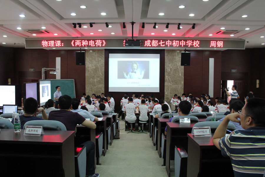 2016年6月17日下午,由成都市教育局主办、我校承办的成都市未来学校研讨会在我校举行。这次研讨会主题为“技术·学习·创新”,分为课堂观摩、经验交流与未来学校规划交流及总结三个部分。成都市教育局综合改革处杨忠斌副处长、电子科技大学陈静萍博士、高新区社会事业局教育处杨晋平处长、高新区教研室李建萍副主任以及13所未来学校试点校代表及区内学校代表两百多人人参加了会议。