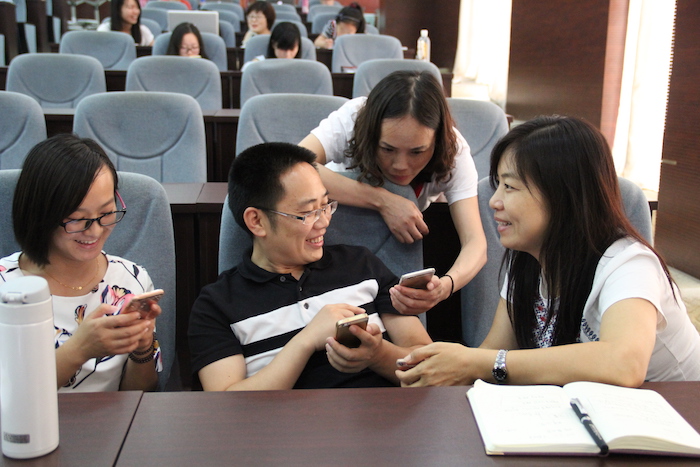 在黎教授的指导下,老师们分组学习、使用分答技术,全场老师们纷纷掏出手机,扫描二维码,猛戳网页链接,注册自己的分答,相互提问,纷纷抢答。场内热烈的气氛很快达到高潮,大家为自己的问题被答而兴奋,为自己解答的问题而反复打磨,互动性、娱乐感深深吸引了大家,纷纷表示互动的学习方式很有成就感。黎教授还对大家项目式学习结果进行了一一点评。