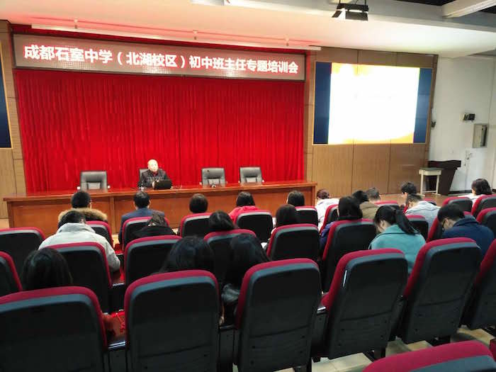 2016年11月11日,初冬的石室中学北湖校区一派温暖如春、生机盎然的景象。我校2017届年级组长、英语组王翔宇老师应邀在该校初中班主任专题培训会上做了一场题为《给自己树一面旗帜——班级管理、文化建设及相关案例分析》的德育专题讲座。