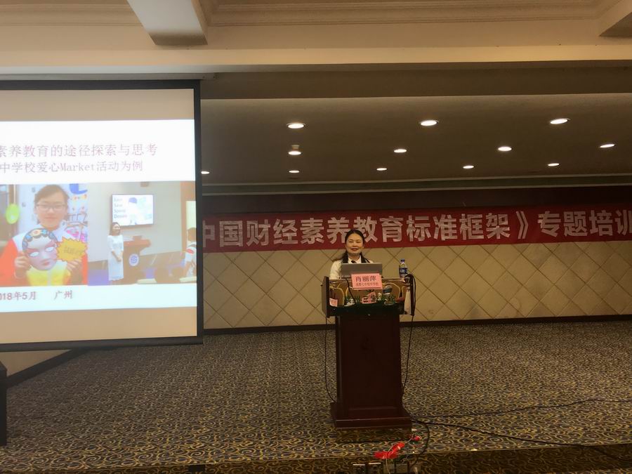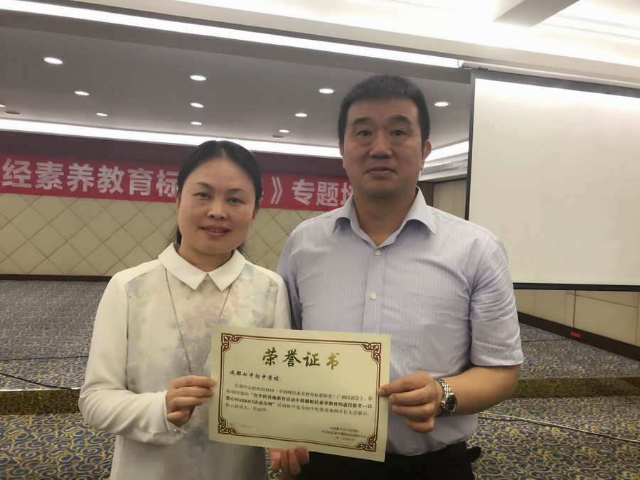 2018年5月8日,《中国财经素养教育标准框架》专题培训会在广州落下帷幕。我校“爱心Market财经素养教育校内实践活动”案例在全国众多案例中脱颖而出,获评优秀案例。中国教育科学研究院殷长春书记为肖丽萍老师颁发了优秀案例获奖证书,肖老师代表学校在大会上做了题为《初中学段开展财经素养教育的途径探索与思考——以成都七中初中学校爱心Market活动为例》的专题发言。