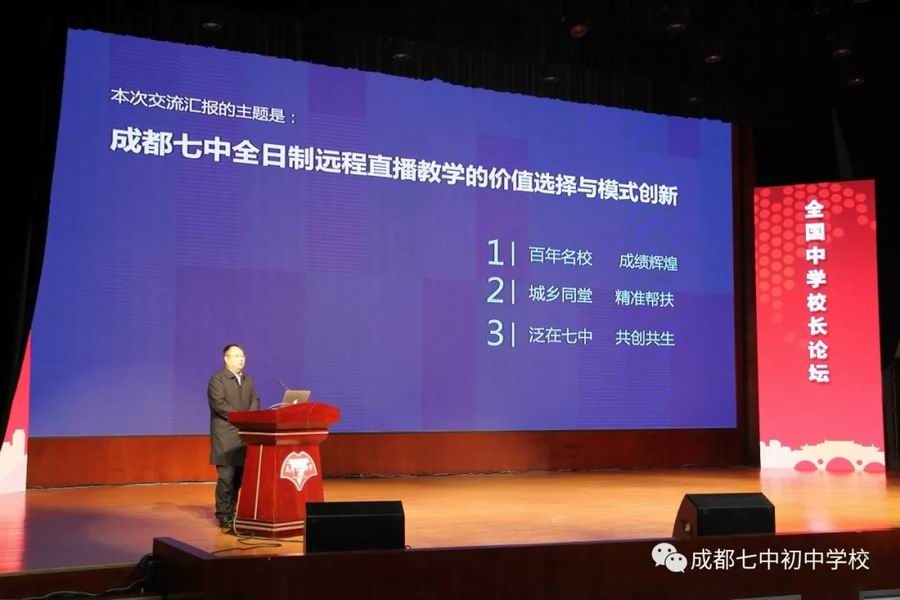 《身为名校 不辞担当》——成都七中全日制远程直播教学的价值选择与模式创新,易校长从“百年名校,成绩辉煌”、“城乡同堂,精准帮扶”、“泛在七中,共创共生”三个方面讲了成都七初作为名校的辐射引领。未来不只是我们要去的地方,而是我们要创造的地方。