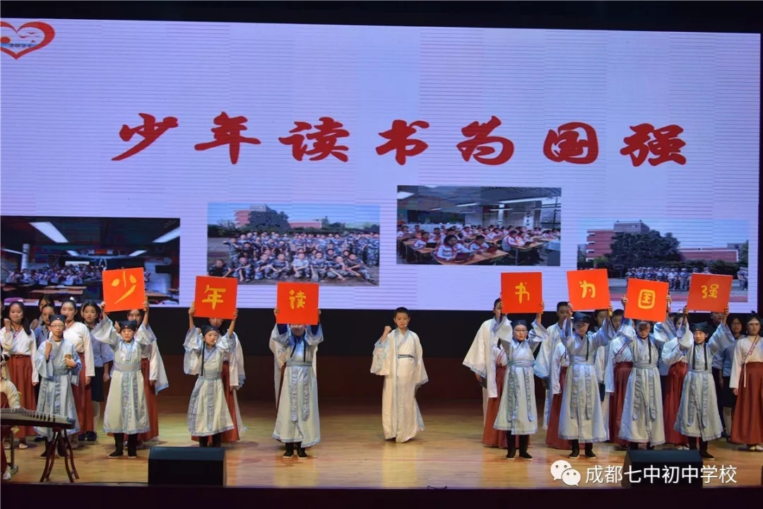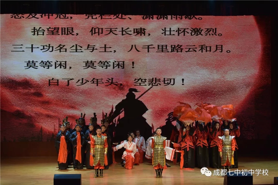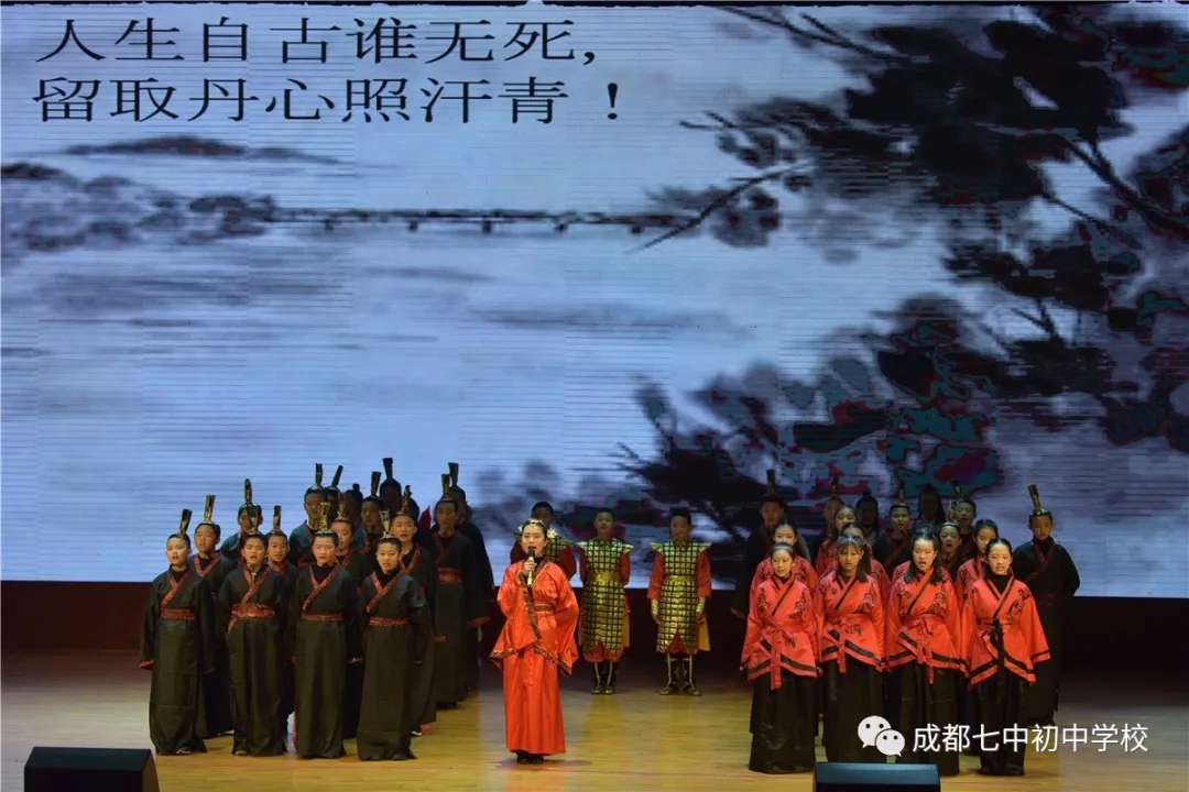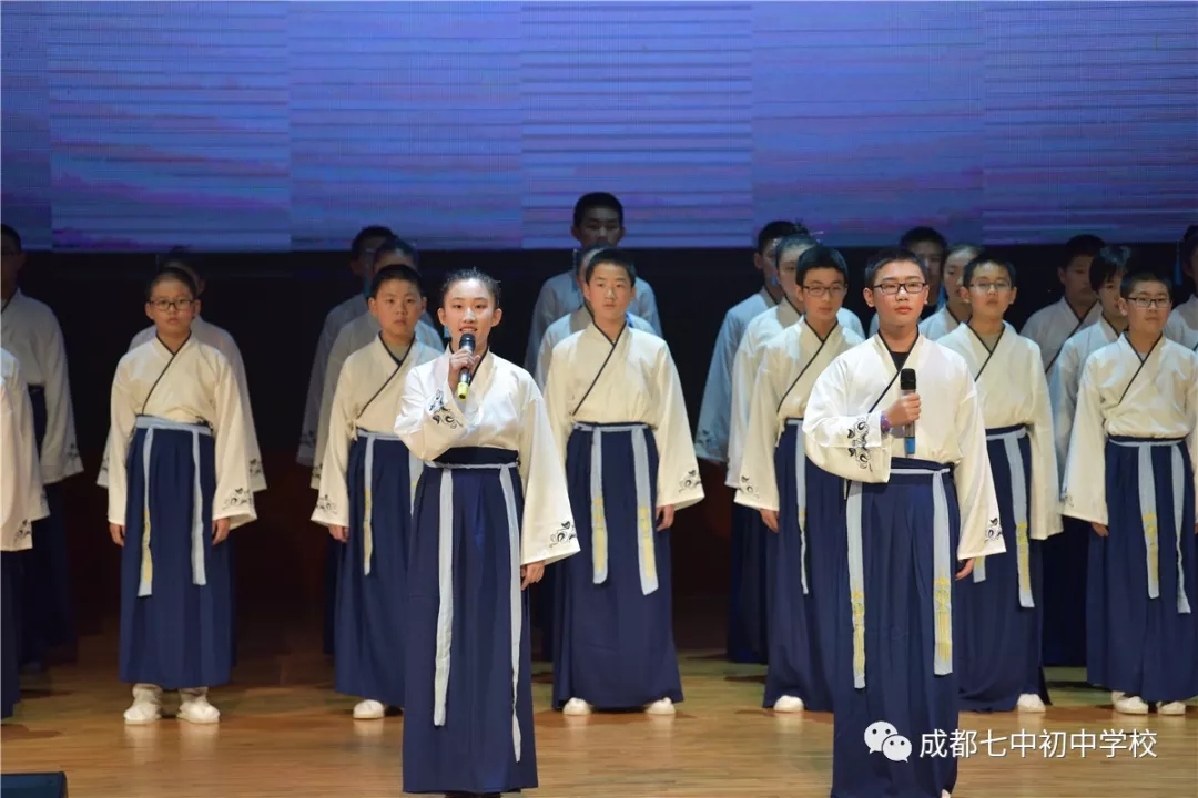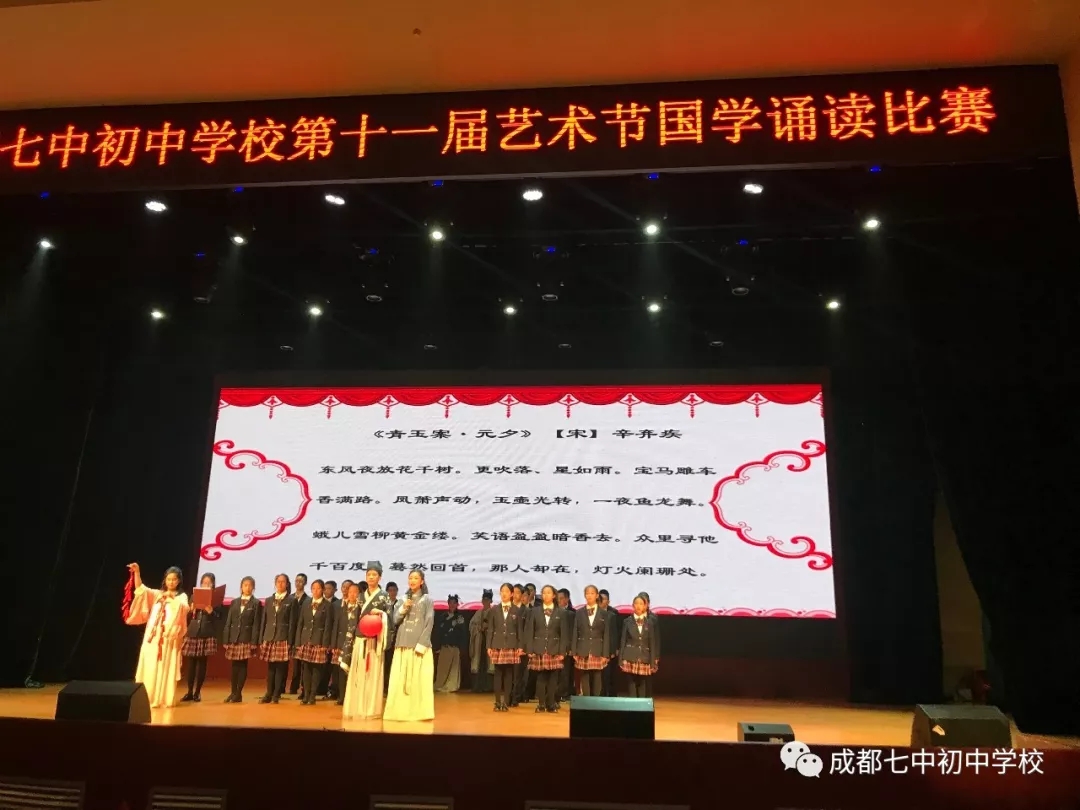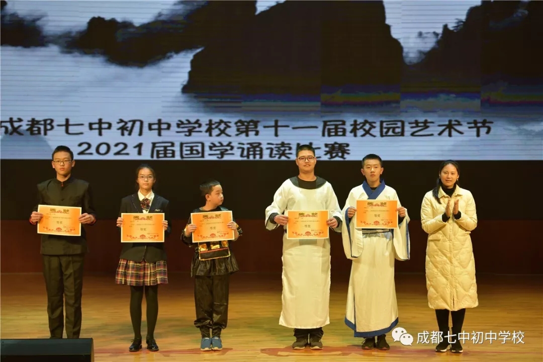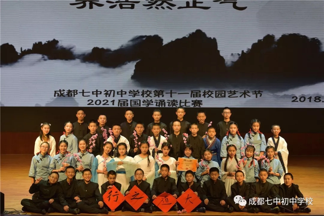 渊博的知识来自日积月累,从容的智慧来自经典阅读。许多时新的东西总是短暂的,那点光芒很快便会熄灭,而经典作品把最内在的价值传递给人类,持久地流传。悠悠中华上下五千年,奔流的时光留下了许多经典文化遗产,在今天,弘扬中华优秀传统文化成为了我们新时代青少年义不容辞的责任。2018年11月29日,成都七中初中学校迎来了第十一届国学诵读主题活动,2021届全体学生参与了本次比赛。