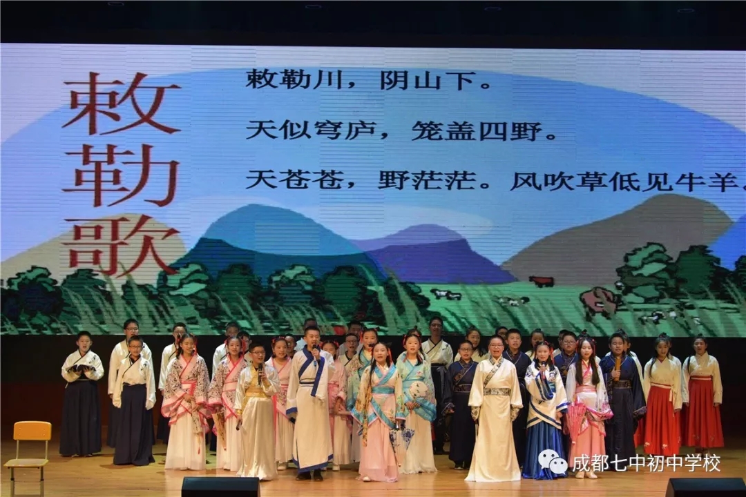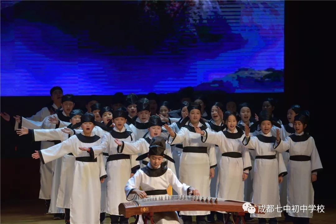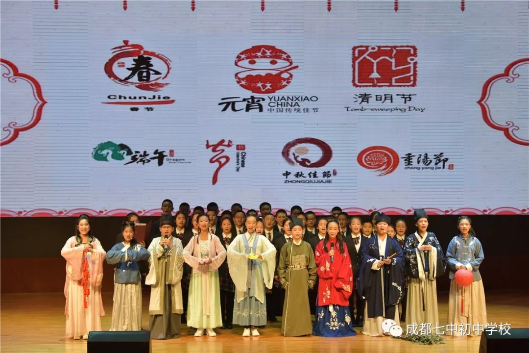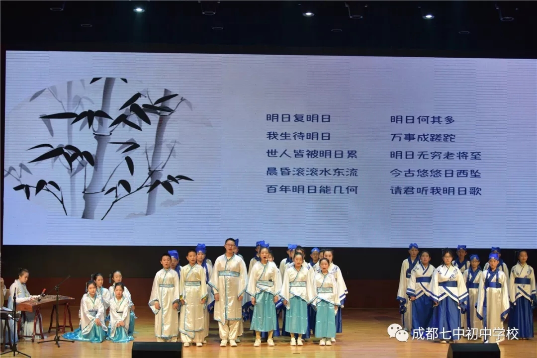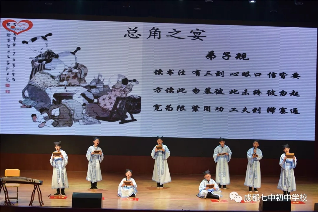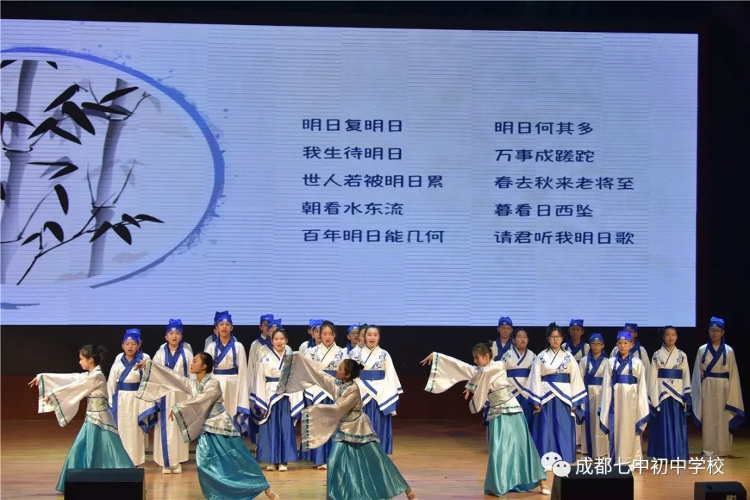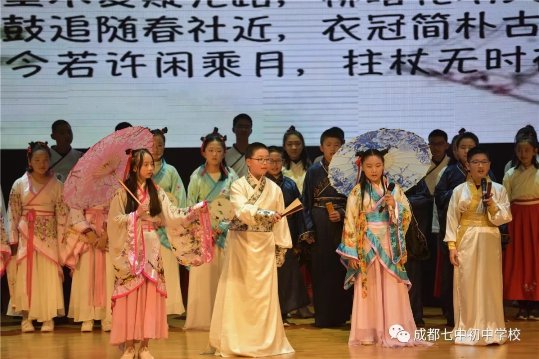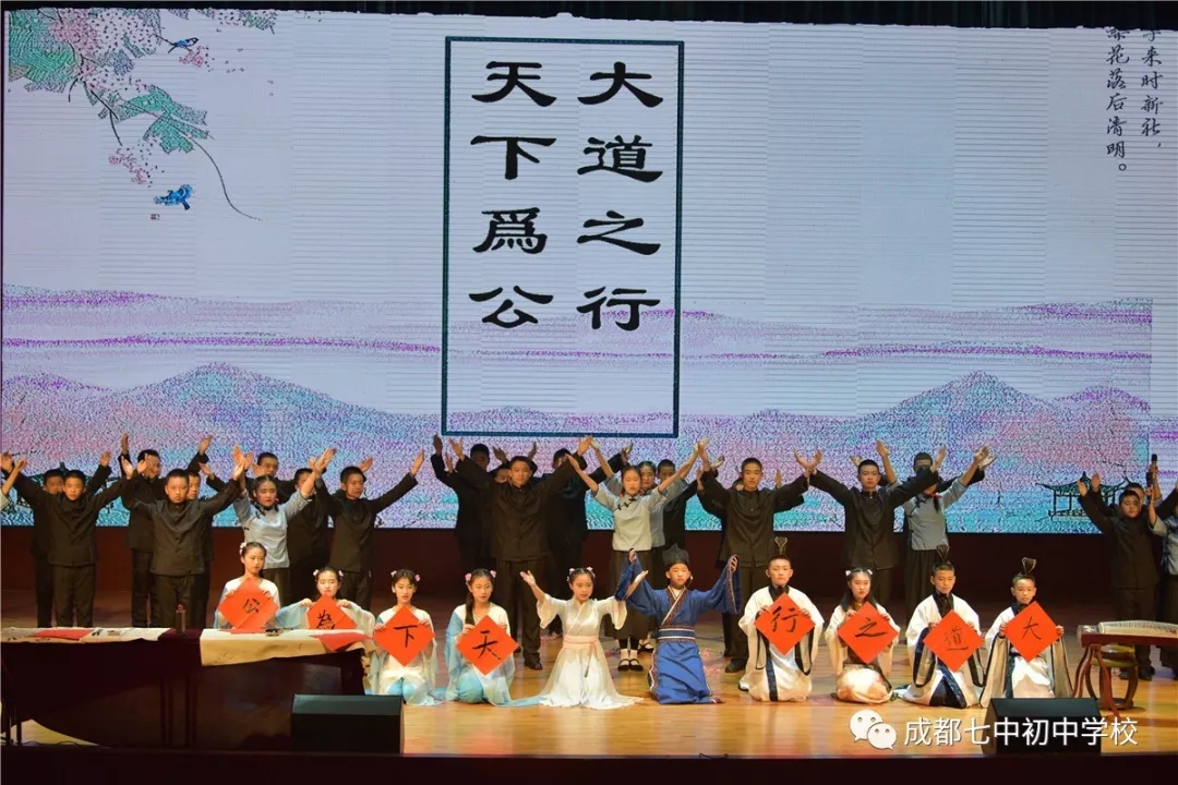 渊博的知识来自日积月累,从容的智慧来自经典阅读。许多时新的东西总是短暂的,那点光芒很快便会熄灭,而经典作品把最内在的价值传递给人类,持久地流传。悠悠中华上下五千年,奔流的时光留下了许多经典文化遗产,在今天,弘扬中华优秀传统文化成为了我们新时代青少年义不容辞的责任。2018年11月29日,成都七中初中学校迎来了第十一届国学诵读主题活动,2021届全体学生参与了本次比赛。