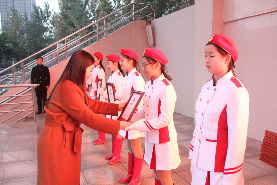 早在一个礼拜前新老队员就在刘贡常老师的指导下紧锣密鼓的准备着本次仪式典礼,本次大会由学生工作部张力生老师主持。当天升旗前,身着整齐运动校服的第十届国旗班成员,迈着整齐划一的步伐跑向主席台正下方,在第九届国旗护卫队员对国旗的最后一次保驾护航后,他们一路纵队步履一致地走上主席台。当主持人光荣地介绍每一位时队员时,他们在掌声不断中站出,敬以标准的军礼。随后,李笑非校长向他们颁发荣誉证书。荣誉过后第九届国旗护卫队副队长李美慧代表第九届国旗护卫队发言,表达出对一年以来工作的感谢。