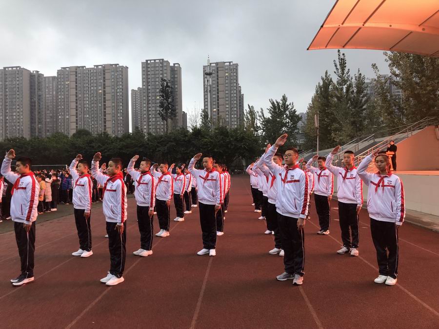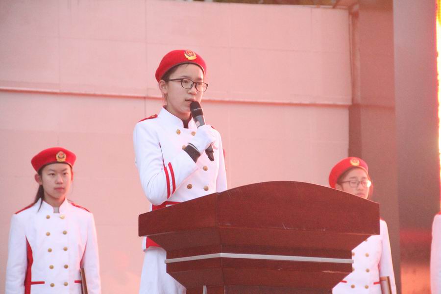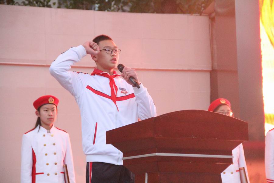 新成员代表当着全体师生的面向国旗庄严宣誓,承诺会牢记自己的使命,捍卫国旗尊严。