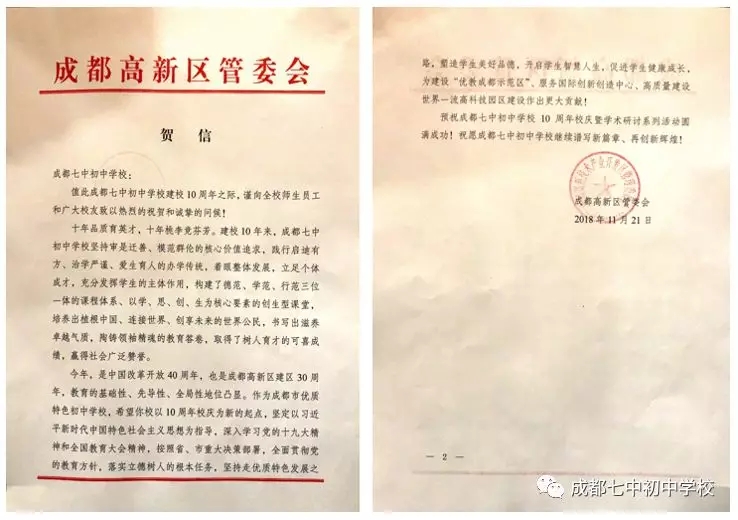 接着由匡世联副局长、主持人和成都七中马健副校长宣读了由成都高新区管委会、成都市教育局和成都七中发来的贺信。