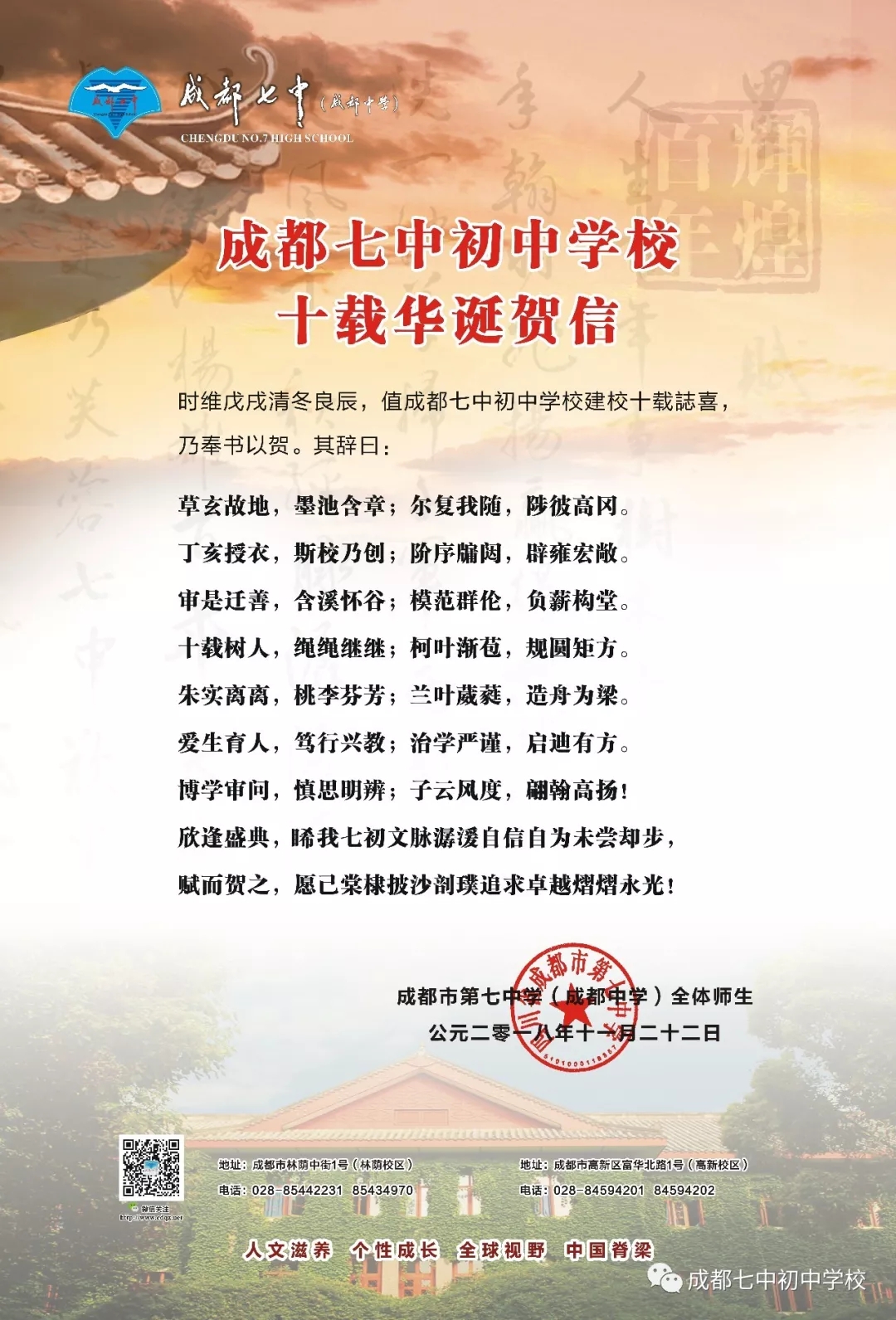 教泽绵长,峥嵘岁月共见证;群策多方,十年庆典奏华章。2018年11月22日19:30,在这个霜清晴明的冬日里,七初师生与四海宾朋齐聚成都七中初中学校音乐厅共庆成都七中初中学校的十周岁生日,恭贺我校芳华永存,十年再出发。