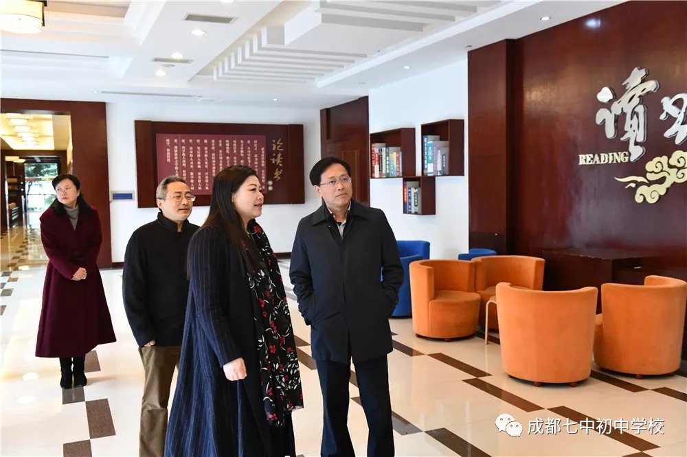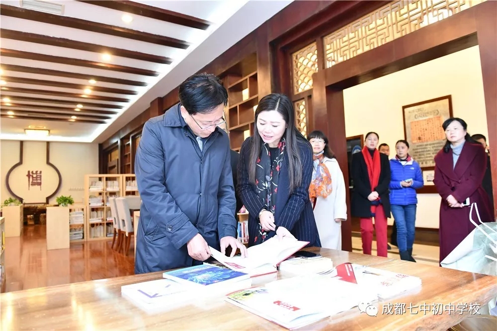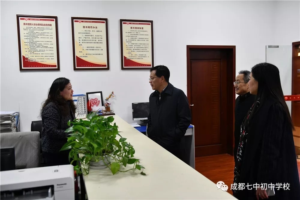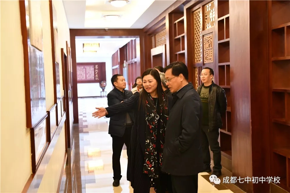 刘强局长先后参观了我校校训广场、音乐厅、图书馆、创客中心等学校教育教学场馆,详细询问了学生的课程学习与艺体活动情况,希望学生能在身心健康的基础上全面发展。他在看到我校学生自信、阳光的精神风貌后,特地为此点赞,并肯定了我校在培养学生领导力、创造力等方面所做出的工作成绩,希望学校能继续做好相关方面的教育研究。刘局长还非常重视阅读在学生成长中的作用,他在学校图书馆专门询问了我校学生借阅图书的具体情况,并翻阅了我校庆祝建校十周年的相关书籍。在看到校园展示屏上播放的毕业生、学生家长对学校校庆活动的情真意切的微信祝福后,刘局长十分感动,指出这就是老师们职业幸福的源泉,并为老师们对学生的真心关爱点赞。我校李笑非校长向刘局长介绍了我校在教师专业成长、学校课程建设、学生发展指导、拔尖创新人才培养等方面所做的工作,刘强局长对此给予了肯定与鼓励,希望我校能在区域内更好的发挥示范作用。他同时指出优秀校长还要在教育改革中更好的进行引领与辐射,为教育事业做出更大的贡献。刘局长对即将迎来十年校庆的我校表示热烈的祝贺,并衷心祝愿成都七中初中学校未来的办学工作更上层楼。