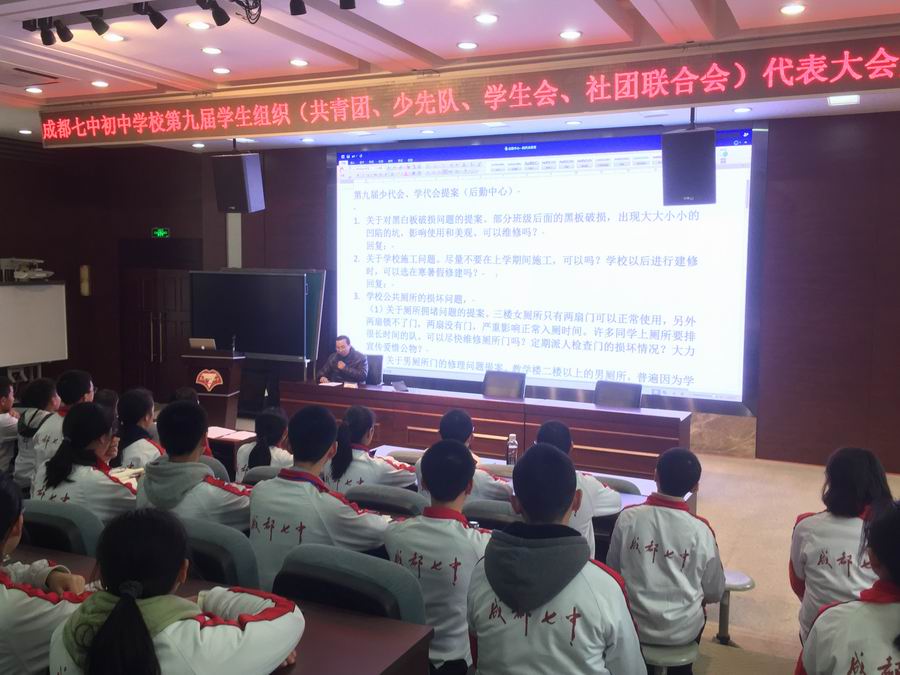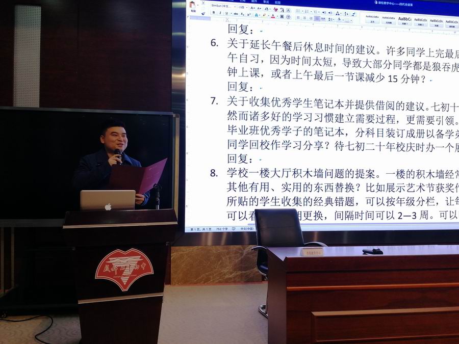 今天会议的主题是: 围绕同学们上交的提案,学校给出相应回复。本次四代会提案共60余条,内容涉及学校发展的多个方面,从食堂的桌椅生锈到操场地面的老化失修,从学校大厅的墙面使用到毕业生优秀笔记本的收集展示,无一不展示出七初学子的主人翁意识。