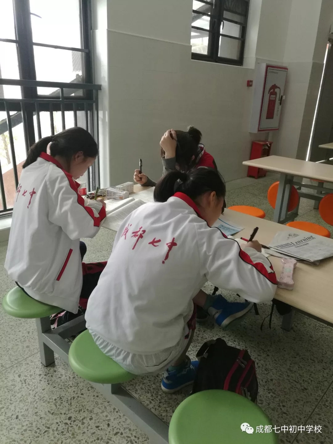 比赛之余,七初学子也不失为一道风景。因为我们是七初人,所以如此与众不同。全体队员认真完成作业,尽管此刻窗外嘈杂热闹,我们却独享一片宁静。