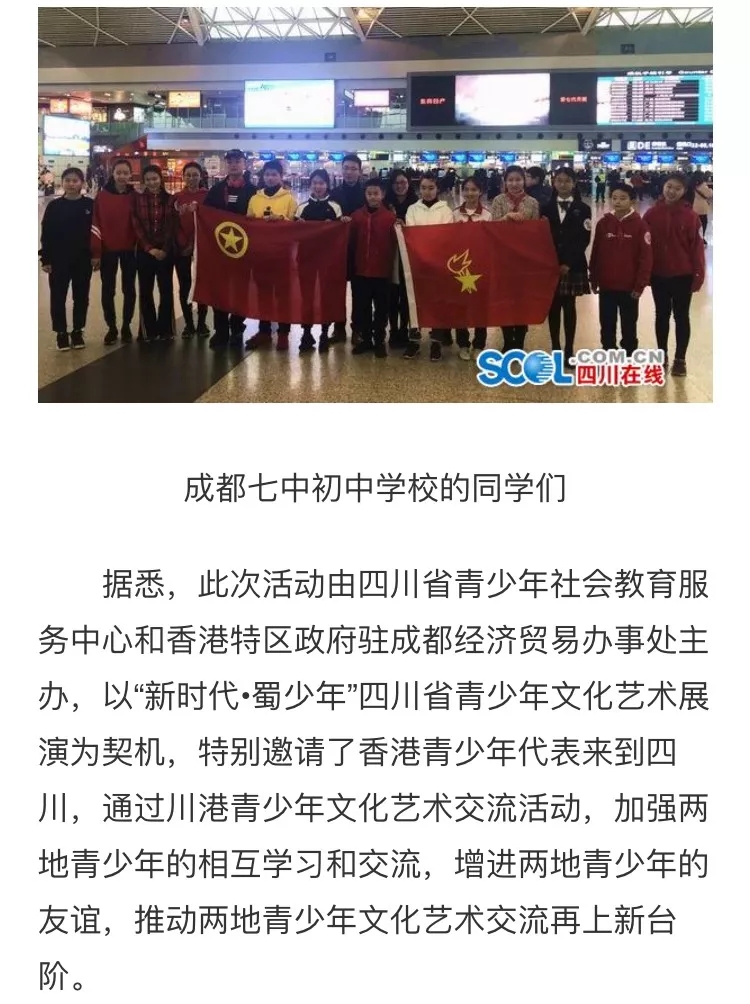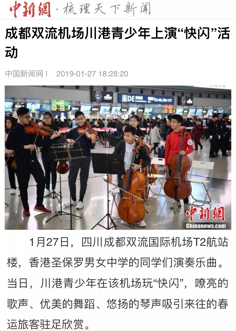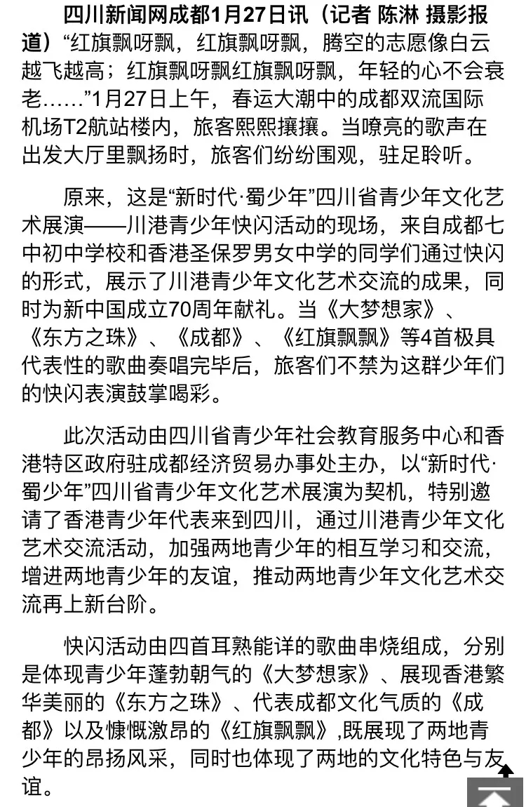 冬季的温柔送走了大寒,年味意浓,成都街头处处是节日的气氛。今年是中华人民共和国成立70周年,1月27日11时,成都双流国际机场T2航站楼,响起了青春的旋律:“那是从旭日上采下的虹,没有人不爱你的色彩,一张天下最美脸,没有不留念你的容颜…”一首《红旗飘飘》唱响对祖国的祝福和热爱。春运熙熙攘攘的人潮中,孩子们嘹亮的歌声、优美的舞蹈和悦耳的乐器演奏让来往的市民和游客们驻足欣赏。原来,这是由四川省青少年社会教育服务中心和香港特区政府驻成都经济贸易办事处主办的,“新时代•蜀少年”四川省青少年文化艺术展演,成都七中初中学校携手香港圣保罗男女中学的学生通过快闪的形式,展示了川港青少年文化艺术交流的成果,同时献礼祖国70华诞,现场,成都七中初中学校学子们展现了他们的风采!