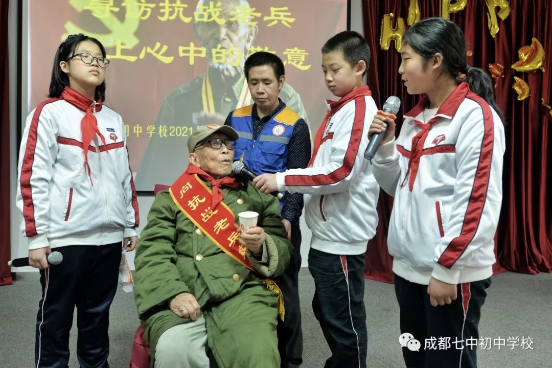 3月17日下午3时许,成都七中初中学校2021届3班(中队)的同学们,走进位于成都市晚霞社会养老院的四川省抗战老兵照护中心,开展“寻访抗战老兵,献上心中敬意”为主题的志愿服务活动。看望慰问了在照护中心的5名90多岁抗战老战士和1名老战士遗孀,聆听了他们的故事,并送去了慰问品。