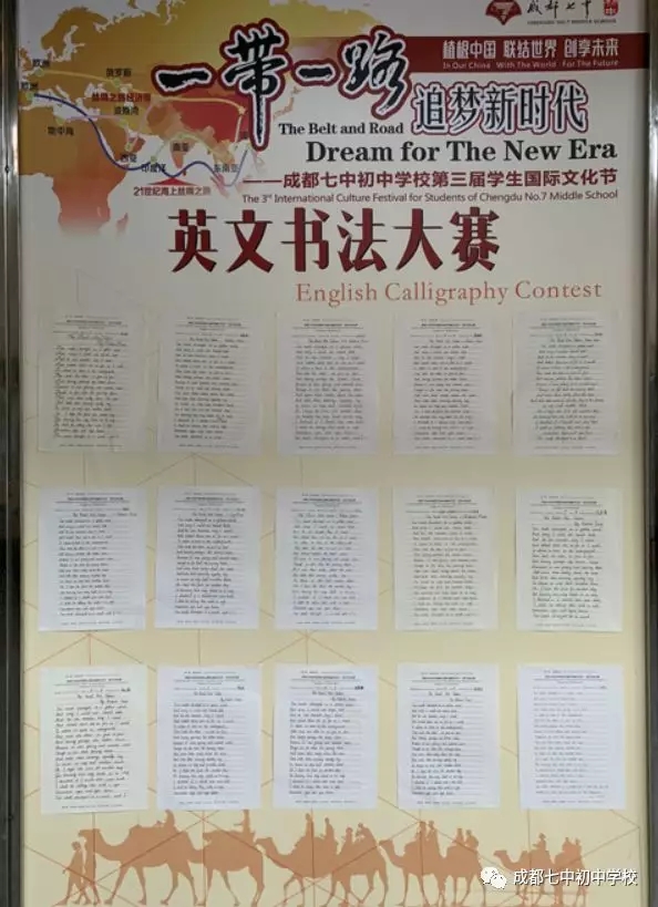 古人云:“字如其人,相由心生。”西汉文学家杨雄也曾说:“书,心画也。” 可见,书写可以直观投射出一个人的性格、心理、情绪,甚至学识、休养和格局等方面的信息。为进一步规范同学们的英文书写习惯、培养良好的静身学习习惯,同时激励全校同学在文化自信的前提下,用世界能看懂的方式,讲好中国故事,传播中国文化,主题为“一带一路·追梦新时代”的成都七中初中学校第三届学生国际文化节系列活动之一的英文书法大赛应运而生。