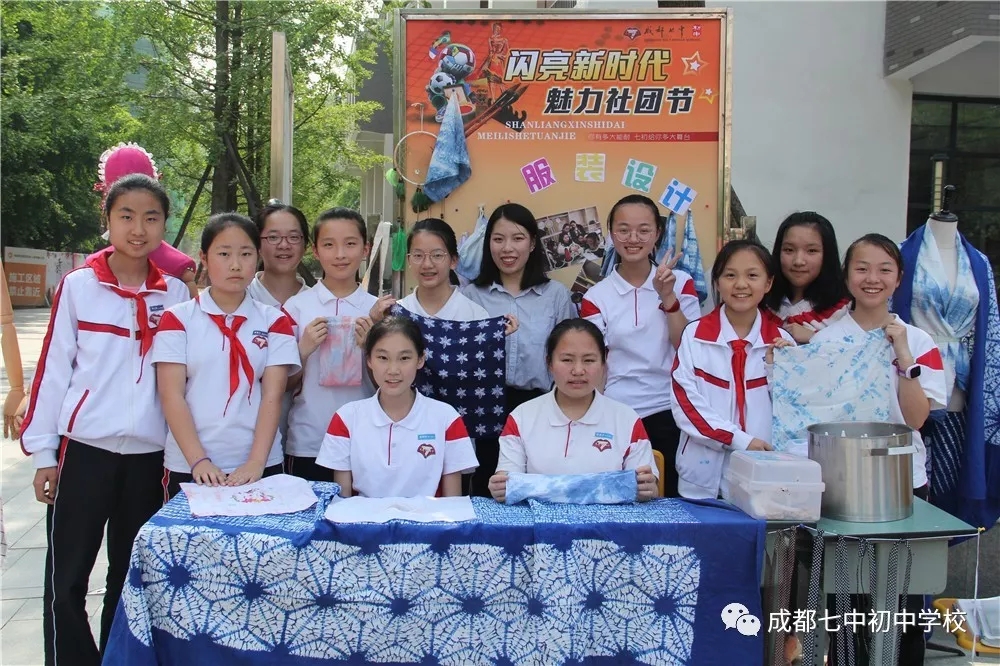 服装设计社:服装设计的同学们正在向来往的老师和学生介绍染布的方法,展示他们所设计的靓丽服装,五彩斑斓的颜料在同学们的手中跳动,白色布料瞬间幻化为一件艺术品。