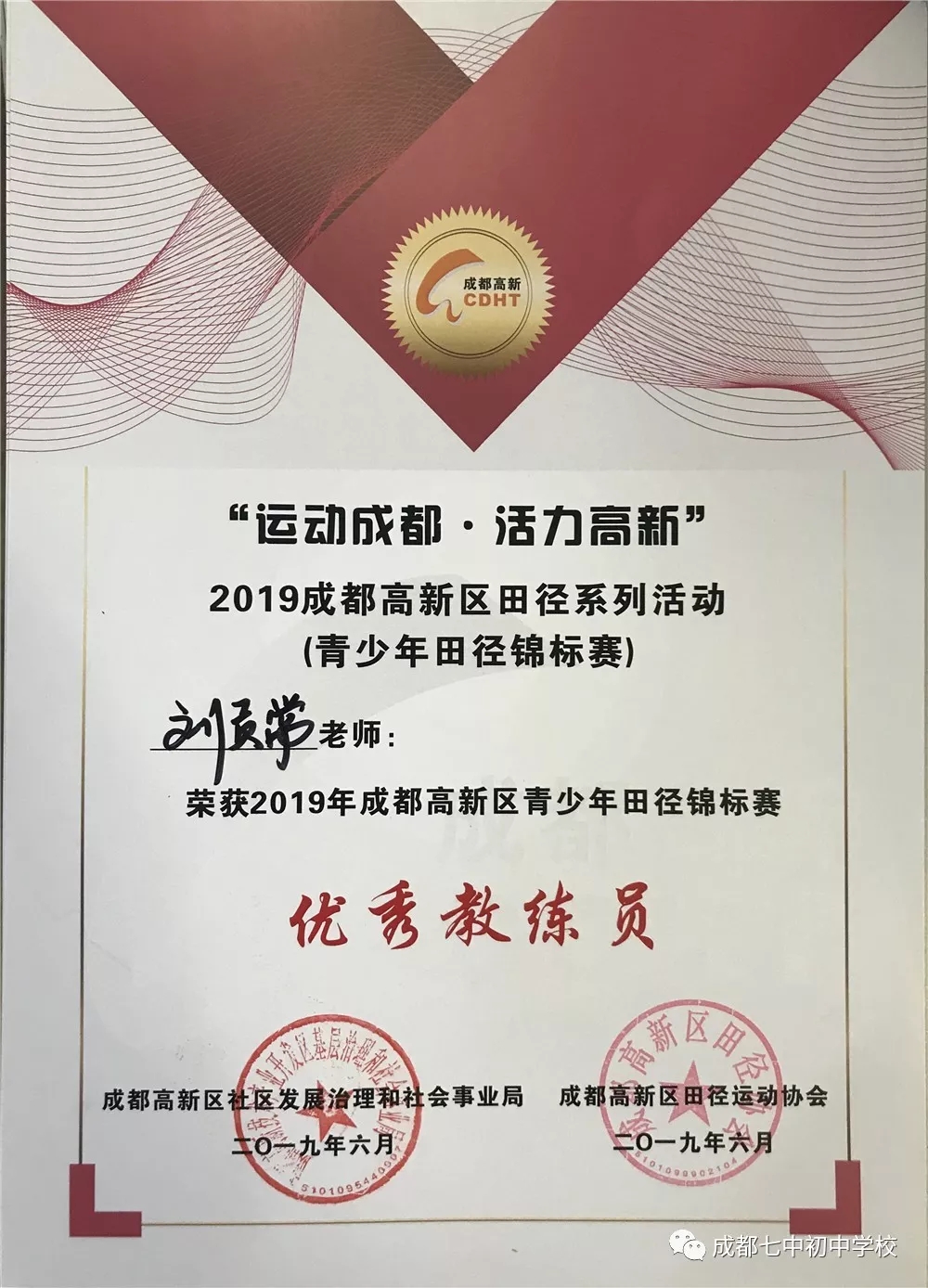 在本次比赛中,田径队主教练刘贡常老师被评为优秀教练员,此次比赛成绩的取得,得益于学校的大力支持和体育教研组的倾情付出,得益于每一位运动员的奋力拼搏!