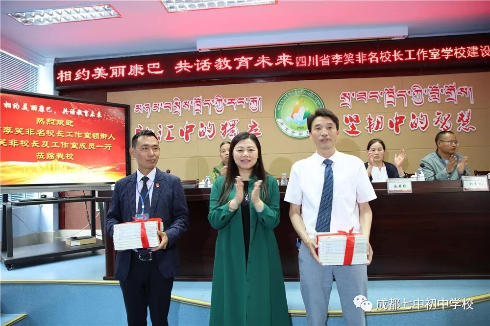 研讨活动的第二个部分是四川省李笑非名校长工作室专题研讨活动。康定市委常委、工会主席余亚琼在致辞中表达了对李笑非名校长工作室来到美丽康定表示欢迎,同时也对李笑非校长及工作室成员对康定教育所做的帮助表示衷心感谢。活动启动仪式上成都七中初中学校还向康定市第三中学、九龙县沙坪中学赠送了图书。
