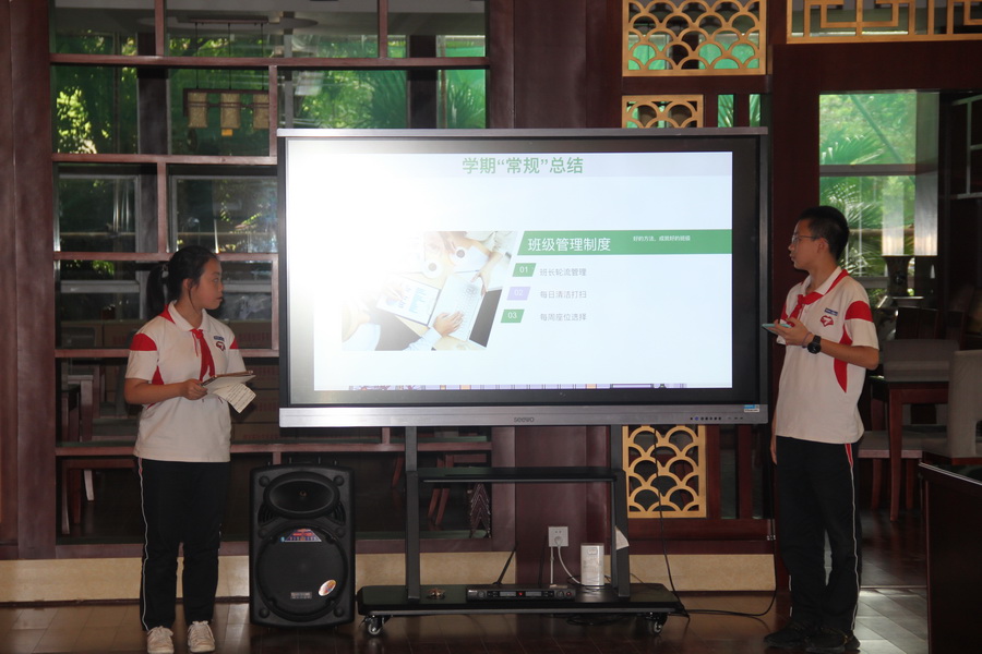 在课程教学中心副主任吴旭光老师的组织下,各班的班委们按顺序介绍了这学期各自班上的情况。各班班委分别从各班的纪律、学习、团队活动和对下学期展望四个方面总结了各自班上同学们的表现以及班委们的做法。每个班的总结各有特色,以不同的方式展现了这一学期以来班委们兢兢业业的工作态度。