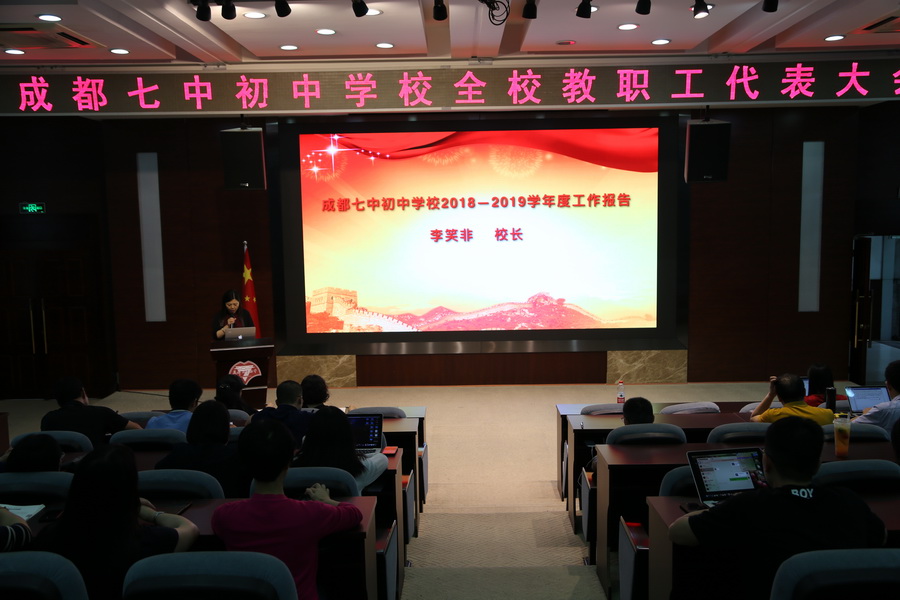 会议首先听取了李笑非校长作的《成都七中初中学校2018-2019学年度工作报告》。报告以《不忘初心担使命,十年砥砺再出发》为题,从九个方面向代表们总结介绍了学校的教育实践。内容包括:立德树人,坚定育人方向,不忘教育初心;坚持以德为先,实现全面发展、知行合一的德育课程体系;以美育人、以文化人的教育活动体系;以建校十年为契机加强教学研究,提升核心素养;构建“是范”课程,丰富课程内涵;整合智能平台,提升教育信息化;加强国际理解,教育国际化高位发展;提高安全意识,做好后勤保障等。