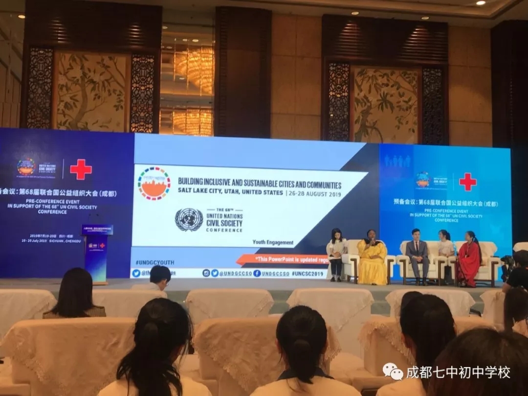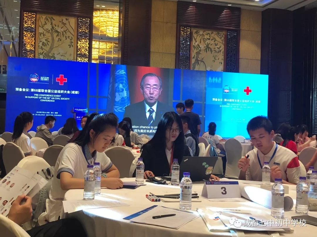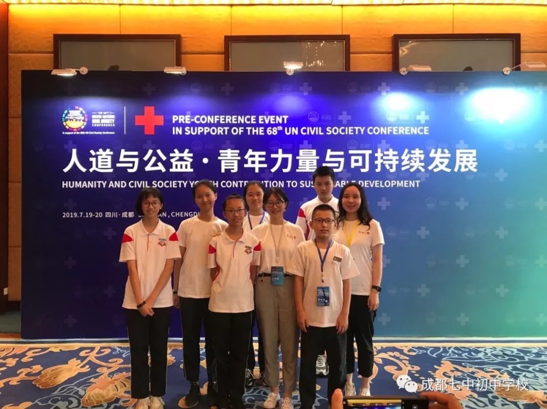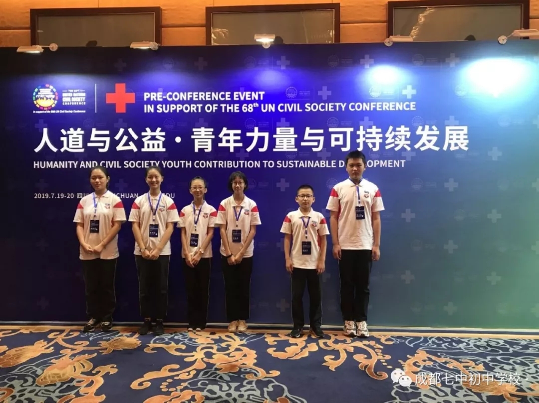 2019年7月20日,第68届联合国公益组织大会在成都落地,这是大会在中国的首次论坛,成都七中初中学校模拟联合国社团的6名学生代表受邀参会,与来自国内外人道、公益界领袖齐聚一堂,在“人道与公益·青年力量与可持续发展”这一主题下,共同探讨了中国公益组织在推进实现2030联合国可持续发展目标中的独特作用。