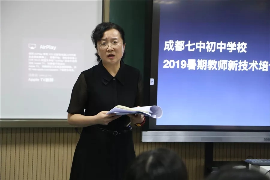 成都七中初中学校王岚副校长作培训总结。王岚校长对教师们在此次培训中表现出的“七初精神”——团结合作、认真务实给予高度赞扬,同时,王岚校长也鼓励教师们在今后的教学中积极运用新技术,让技术服务于教育,为培养适应未来社会的孩子做出努力。
