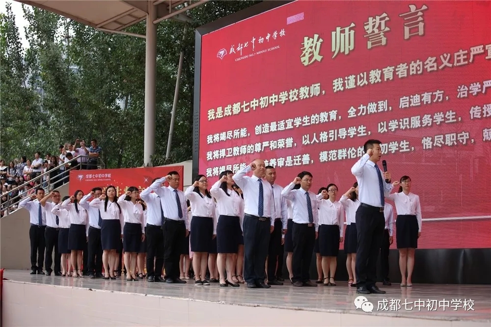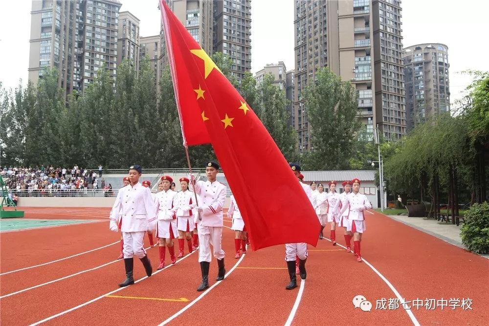 雨后新晴,国歌嘹亮。国歌激扬的音符响彻每个人的心扉。成都七中初中学校校旗也迎着秋日微风徐徐升起,孩子们纯真美好的校歌声回荡在绿草如茵的运动场上。