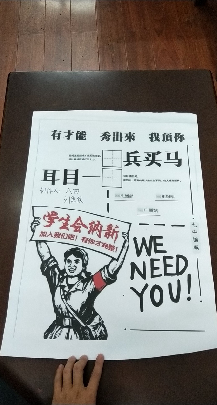 为了招新,团委的干部们精心设计了海报,一张贴便吸引了许多学生下课驻足观看。