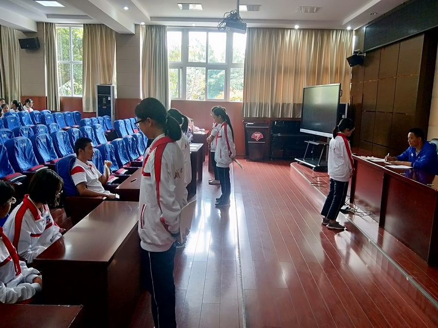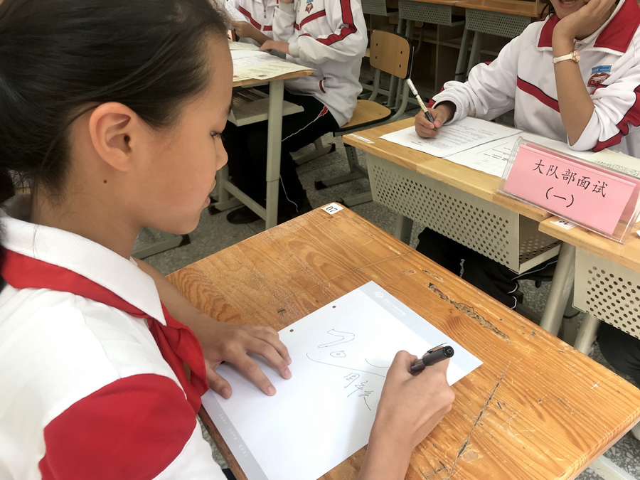 2019年9月27日,终于迎来了面试的这一天。面试现场,一边是一本正经的小考官们,另一边是焦急等待的同学们。虽然很紧张,大多数同学们都有备而来。一说自我介绍,便流利得让老师和小考官们记忆犹新。一说设计艺术字,一个个都成了艺术家的化身,潇洒的一挥,豪迈的字彰显出七初情。面试问题更是考验同学们的责任心,比如1.什么是学生干部?学生干部具备的素养有哪些?