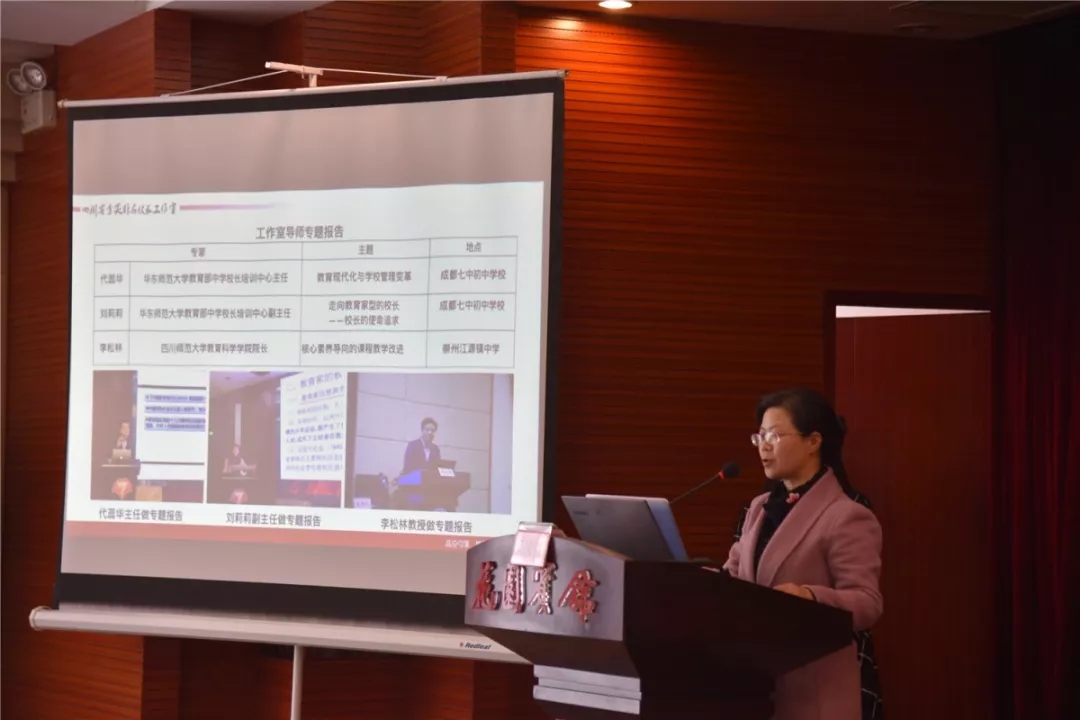 工作室成员、成都经济技术开发区实验中学校王英副校长从“扬帆起航、导师引领、主题研讨”三个方面汇报了工作室的成立情况,如何在优秀的导师们的引领和指导帮助下健康发展、茁壮生长和优质成长,以及如何通过系列化、主题式、侧重点不同的主题研讨活动,实现工作室成员和学员间的智慧共融、创新发展。据不完全统计,本年度工作室举办主题研讨活动10余次,导师、专家和领衔人做主题报告14次,成员做主题发言8次,帮扶指导研究课5次,共计2000多人次参加。