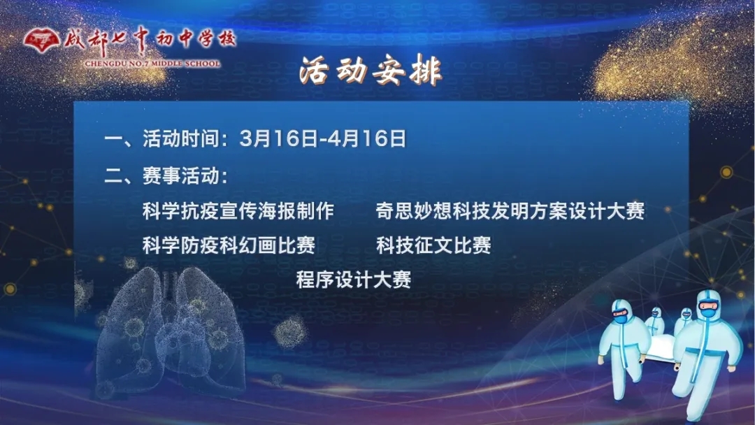 学校科技活动总辅导员老师郭建在大会上介绍了本次科技活动月的活动安排和比赛规则:本次科技活动月,所有活动均通过网络进行,活动时间从3月16日到4月16日。本次活动内容丰富,形式多样,有奇思妙想科技征文比赛、科学抗疫宣传海报制作大赛、科学抗疫科幻画比赛,也有程序设计大赛、科技发明方案设计大赛等多项比赛活动。同时,学校邀请到中国科学院成都生物研究所研究员、博士生导师罗鹏博士在3月23日早上8:00-8:50,为我们带来《野生动物与人类疫病》的线上专题讲座,为大家科普人类社会的抗疫史。