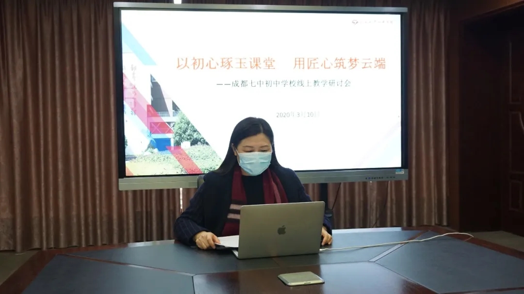 ▲工作室领衔人、成都七中初中学校李笑非校长在全校教职工大会上指导疫情防控工作和延期开学在线教学工作