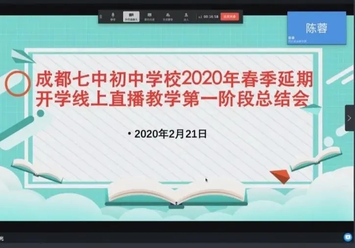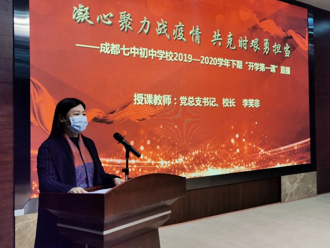▲工作室领衔人、成都七中初中学校李笑非校长主讲“在线学习开学第一课”