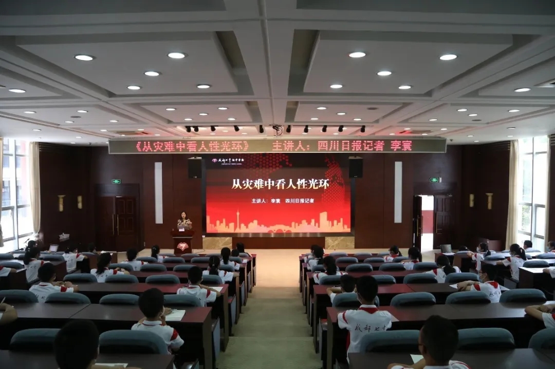 2020年5月18日,四川日报记者、国家紧急医学救援队队员李寰为我校两校区全体教师及七八年级学生带来一场主题为《从灾难中看人性光环》的专题报告,带领我们再次走进那场没有硝烟的战斗,触摸那一方镜头下的刻骨铭心。