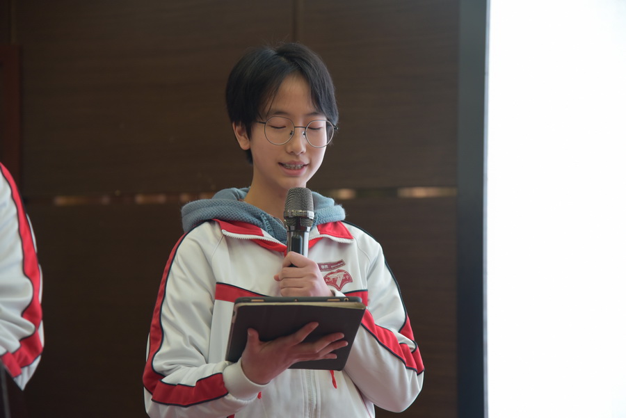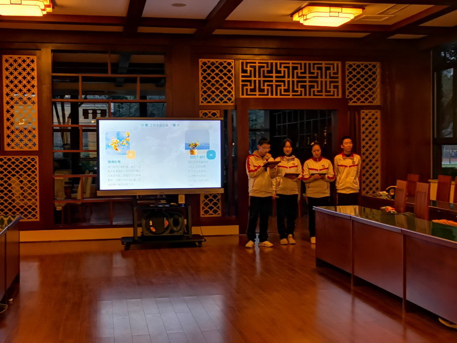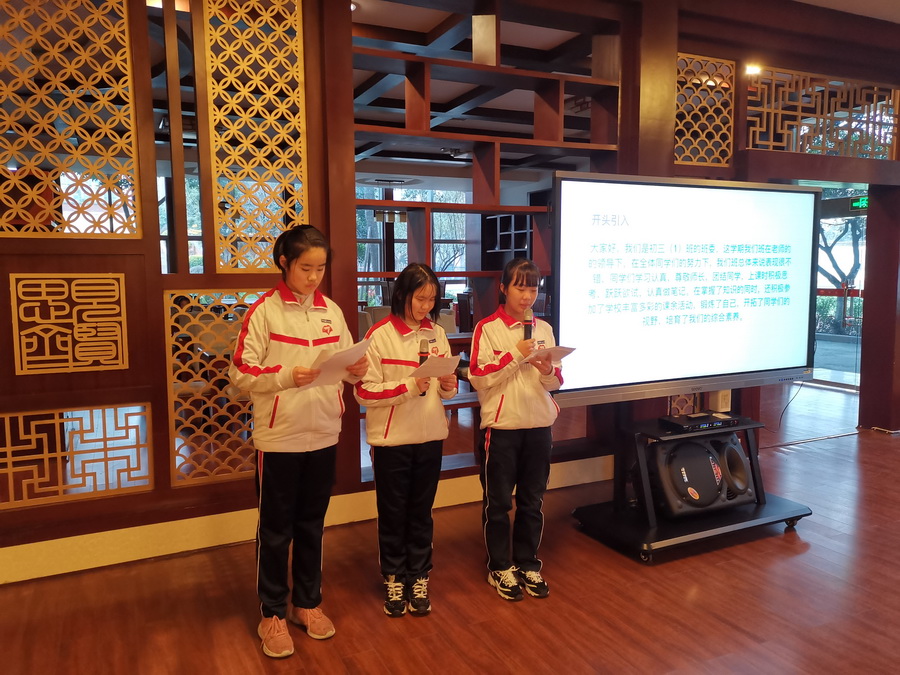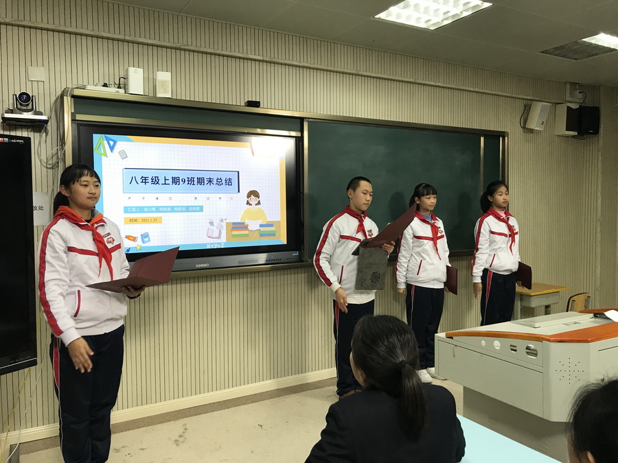 9班:任芊羽、刘思言、汪志恒从容、仪态大方,从纪律、学习、常规三方面对班级发展中的亮点、不足与解决措施进行了总结。