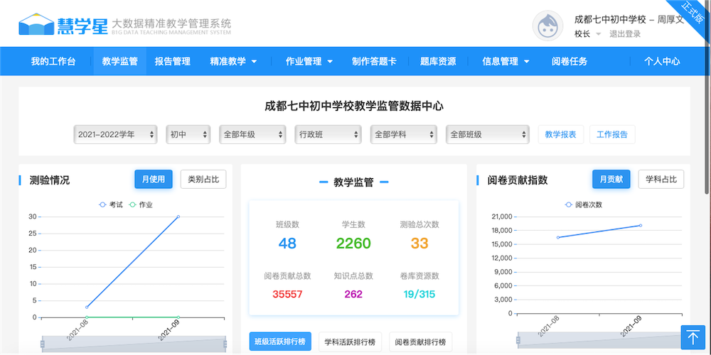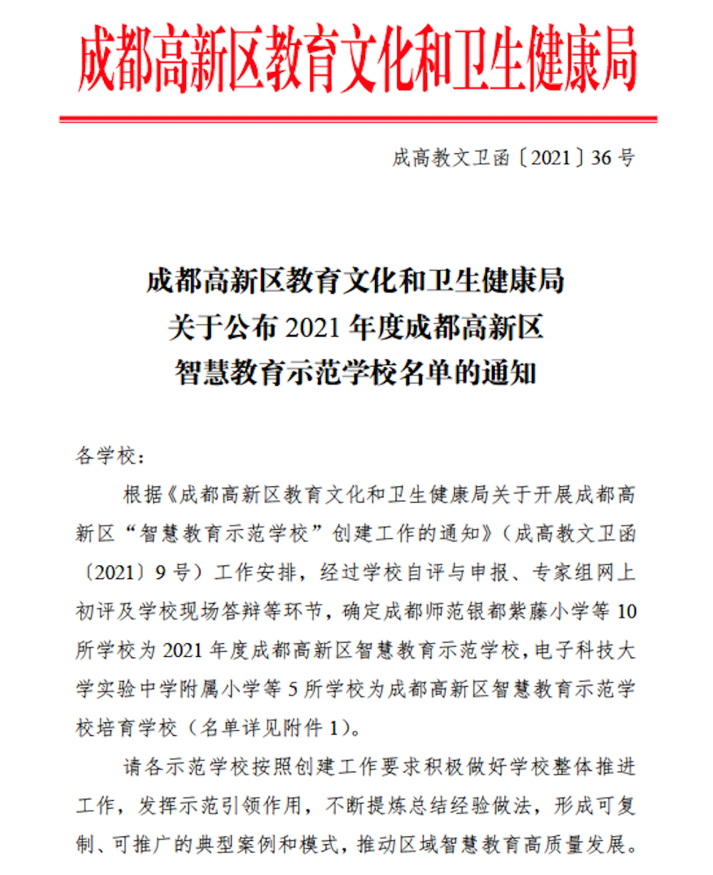 近年来,我校坚持育人为本、融合创新、系统推进,初步实现从基础建设为主到创新应用为主、从数字校园到数据校园、从深度融合到创新融合的三大转变,全面提升我校师生的信息素养。经过全校师生的共同努力,2021年11月,经过学校自评、材料审核和学校现场答辩等环节,我校顺利通过了验收,成为成都高新区2021年度智慧教育示范学校。