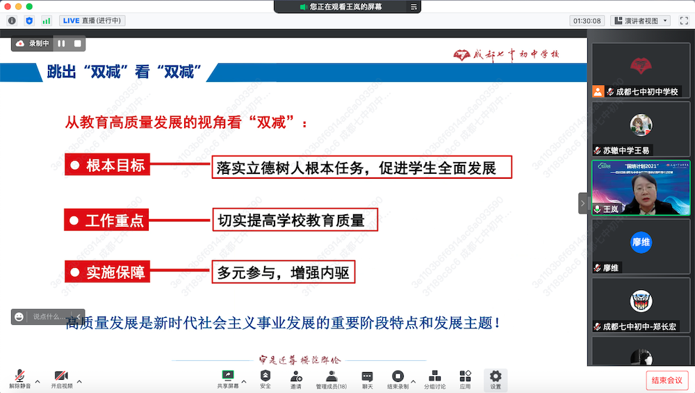 11月8日下午,成都七中初中学校副校长、锦城校区执行校长王岚副校长为参训老师做了题为《"双减"背景下,指向学生全面发展的课程变革》的专题报告。王岚副校长结合“双减”背景,为老师们讲述了成都七中初中学校的课程改革实施路径,结合具体的案例从学校“是范”课程体系、创生型课堂、课题研究以及作业设计等方面进行了详细的阐述。