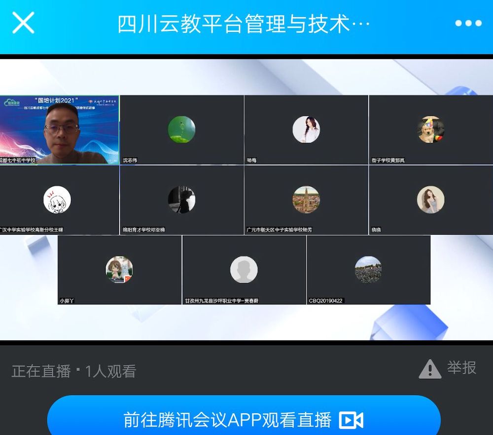 为落实四川省教育厅《关于开展“国培计划2021”——四川云教名优教师陪伴式研修的通知》,进一步推动“四川云教”成都七中初中学校联盟各学校的高质量发展,我校在联盟内遴选了17位优秀的种子教师,举办了“四川云教”成都七中初中学校联盟名优教师陪伴式研修班。
