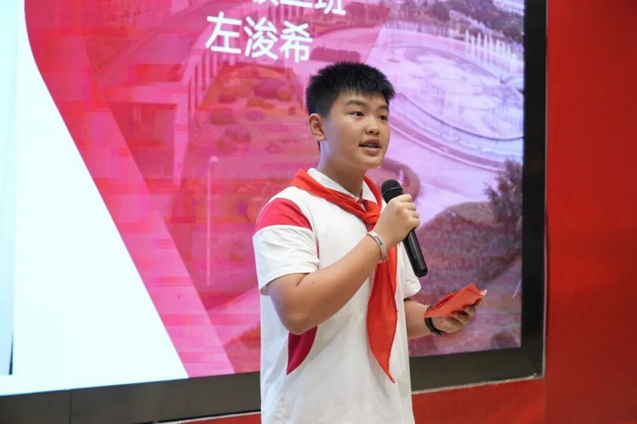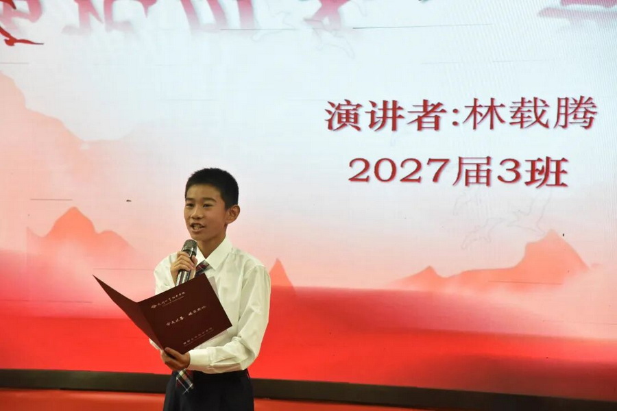 2027届9班的王辰曦同学讲述了英雄的伟大事迹和现代科技的欣欣向荣,并号召同学们勿忘国耻,强国有我!