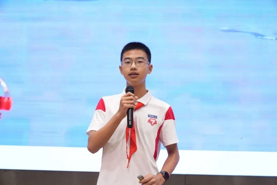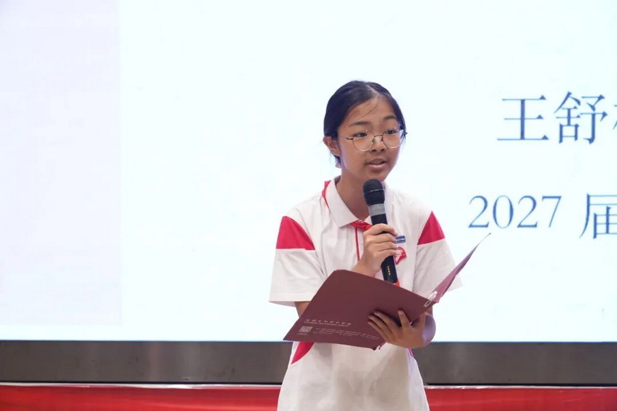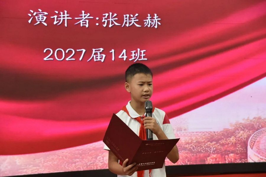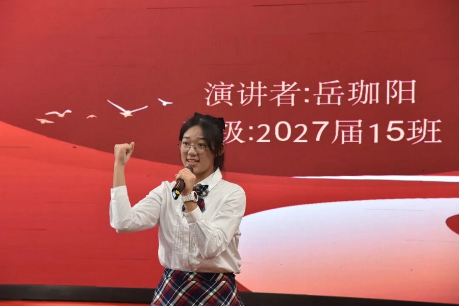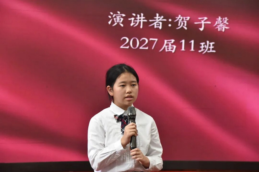 2027届1班胡弈辰同学以“怀敬畏之心,赴时代之约”为主题,激励同学们将“强国有我”的信念化作课堂专注、运动场拼搏等实际行动。