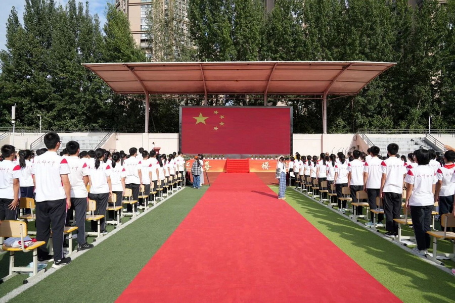 在天环校区,成都七中初中学校党委委员、副校长何鑫向同学们讲述了九三阅兵仪式上80面功勋荣誉旗帜背后的感人故事,提醒同学们绝不能忘记为中国革命和建设事业献出宝贵生命的2000万名烈士,也绝不能忘记为新中国默默耕耘的大国脊梁,以及无数挥洒汗水的建设者和守护者。她说,这不是简单时序意义上的节日,更是这个国家最重要的纪念日,镌刻着亿万人民对幸福的希冀和追求。